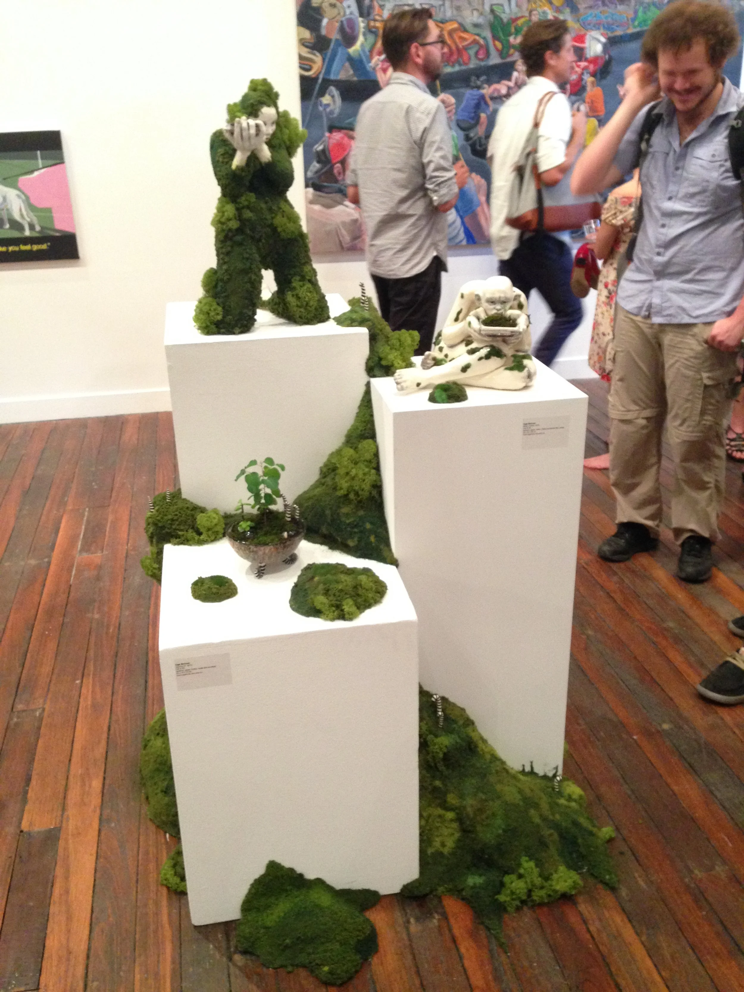 Platform Sublime speaks of the creation of intricate worlds in the digital space and the awe and beauty we create for our players. The figures, transfixed by their overgrown consoles, seem lost in quiet contemplation, suggesting these devices are gateways to imagined realms where thought and play intertwine. The moss gardens emerging from the gaming devices act as metaphors, they are living, breathing symbols of escapism, where digital interaction becomes a form of meditation.